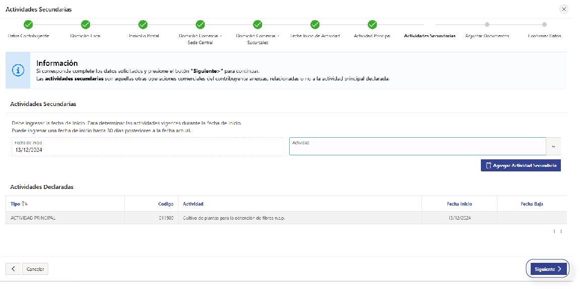 Completá los datos requeridos de ‘Actividades Secundarias’, en caso de corresponder, y presioná ‘Siguiente’