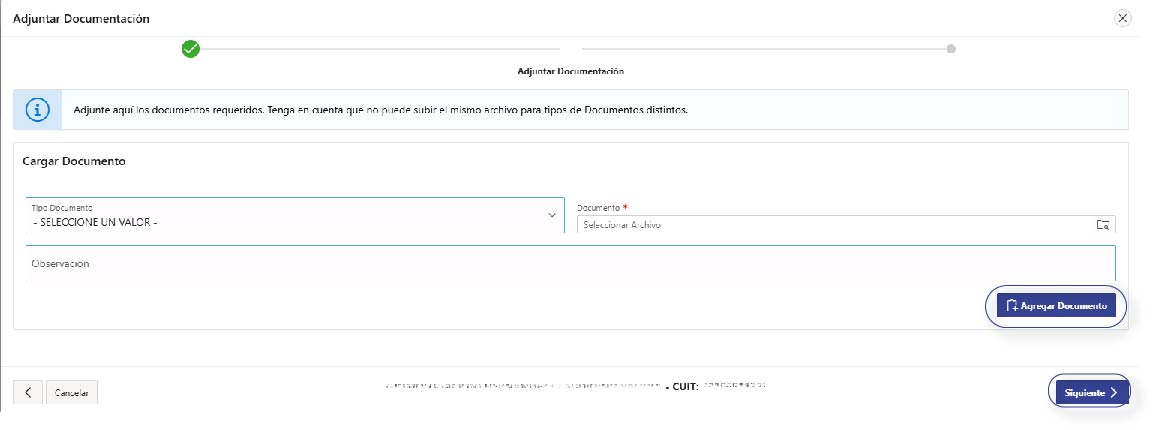 Adjuntá la documentación según corresponda. Tené en cuenta que, por cada Tipo, debés hacer clic en A’gregar Documento’; una vez cargados los documentos, presioná ‘Siguiente’
