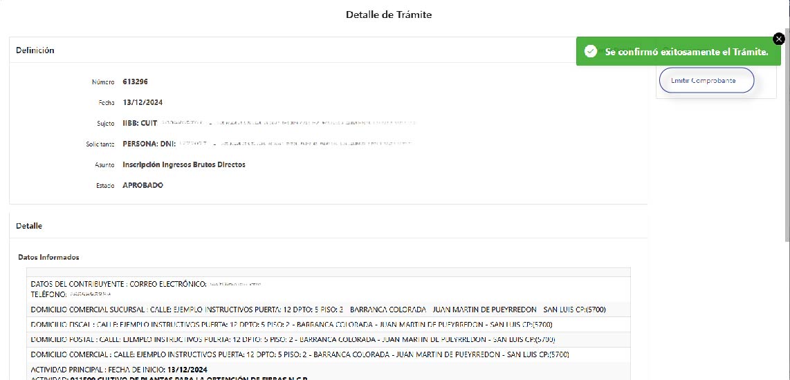 Se muestra el resumen del trámite generado. Hacé clic en ‘Emitir Comprobante’ para descargar el PDF, o clic en ‘Cerrar Detalle’