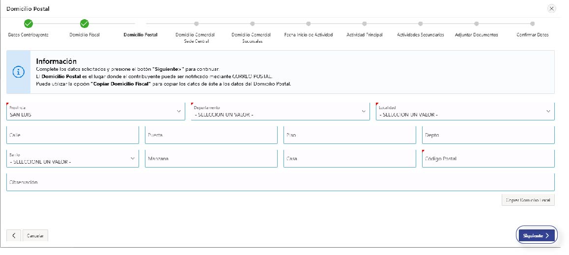 Completá los datos requeridos del ‘Domicilio Postal’ (hacé clic en ‘Copiar Domicilio Fiscal’ si es el mismo) y presioná ‘Siguiente’