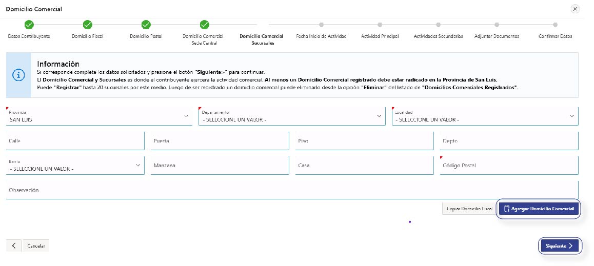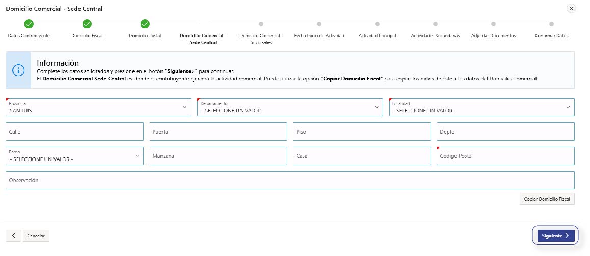 Completá los datos requeridos del ‘Domicilio Comercial’ (hacer clic en ‘Copiar Domicilio Fiscal’ si es el mismo o clic en ‘Agregar Domicilio Comercial’ si es diferente) y presione ‘Siguiente’