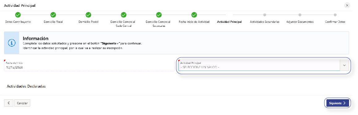 Seleccioná la Actividad Principal y presioná ‘Siguiente’